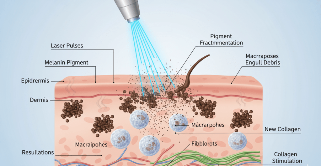 Pigment often sits deep in the skin. Because of this, creams may not reach the real cause. Q-switched toning targets the pigment directly.